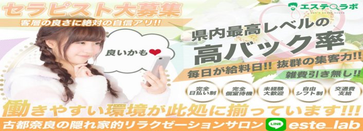 求人新着情報 大和郡山市 出張型 営業中 いちじくとすもも 未経験が7割以上♪ ホテル型だから自由度が高い♪ 空いた時間に働ける… 更新日:2026/03/18/(水) 斑鳩町 個室サロン 営業中 エステラボプラス 当店では一緒にお仕事して頂ける セラピストを大募集しております(o^^o … 更新日:2025/10/27/(月) 奈良市内 出張型 営業中 OLive奈良 セラピストは、カウンセリングやアロマトリートメントを用いて、身を癒… 更新日:2025/06/09/(月) 奈良市内 個室サロン 営業中 カルロビコロナーダ 奈良・大阪・京都で勤務の副業セラピストさん! 身バレしない当店で働き… 更新日:2024/08/10/(土) もっと見る